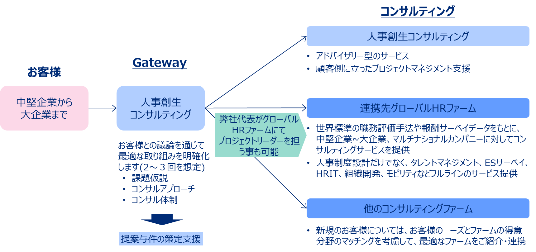 人事創生コンサルティングの特徴は、コンサルティングサービスを自社で提供する事を前提としない相談者であることです。現段階では、完全な独立性とまではいえませんが、お客様本位の立場で課題を明確化し、コンサルティングアプローチや体制を一緒に考えさせて頂く事ができます